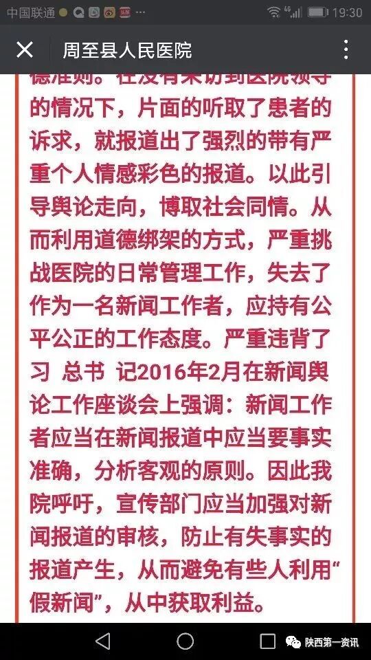 5,周至县人民医院用大字报的文风驳斥说:我院认为个别媒体记者在报道的过程中,失去了一个媒体人最基本工作的道德准则。在没有采访到医院领导的情况下,片面的听取了患者的诉求,就报道出了强烈的带有严重个人情感彩色的报道。以此引导舆论走向,博取社会同情。从而利用道德绑架的方式,严重挑战医院的日常管理工作,失去了作为一名新闻工作者,应持有公平公正的工作态度。