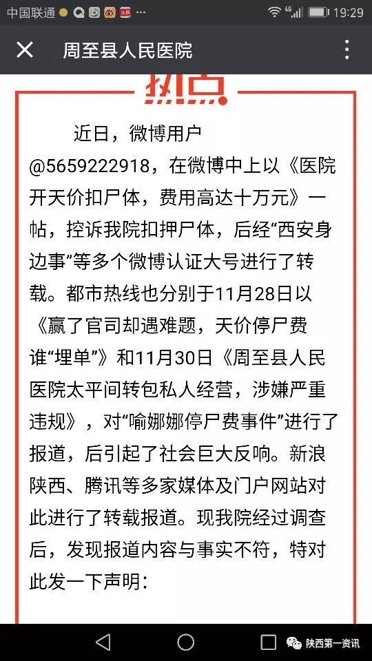 新闻播出后,周至县人民医院于11月30当天立刻通过自己的官方公众号予以反驳说:现我院经过调查后,发现报道内容与事实不符。认为个别媒体记者在报道的过程中,失去了一个媒体人最基本工作的道德准则。在没有采访到医院领导的情况下,片面的听取了患者的诉求,就报道出了强烈的带有严重个人情感彩色的报道。以此引导舆论走向,博取社会同情。从而利用道德绑架的方式,严重挑战医院的日常管理工作。