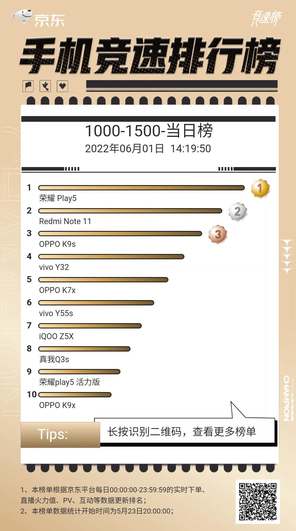 在1000-1500档位,荣耀拔的先机,play5占据第一,红米note11紧随其后,oppo vivo也在后面追赶。