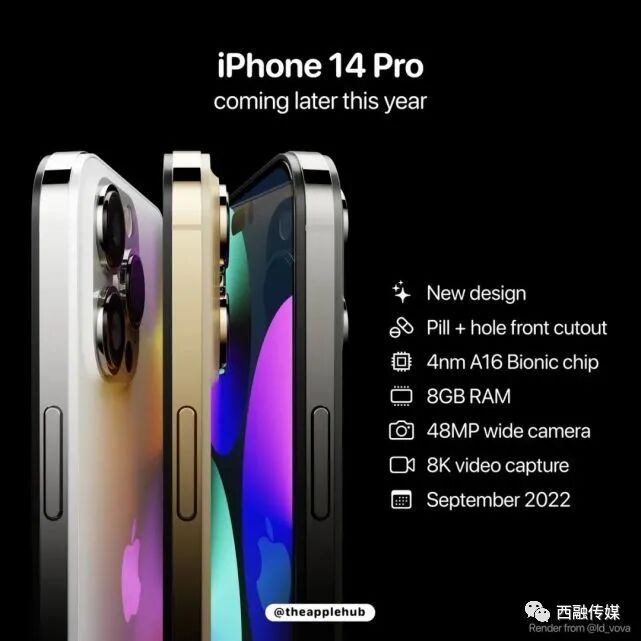 除了名称和大体机型消息,现在,推特用户 @theapplehub 也为我们带来了 iPhone 14 Pro 的最新设计作品以及主要硬件规格。